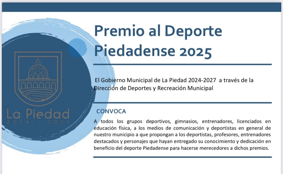 La Piedad, Michoacán. 14 de octubre de 2025.- Ya se publicó la convocatoria para contender por cuatro categorías al deporte piedadense: Deportista del Año, Mérito al Deporte, Promesa Deportiva y Deporte adaptado.