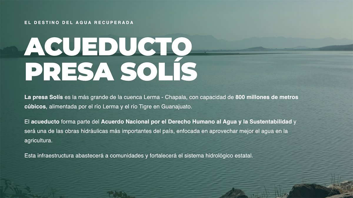 El Acueducto Solís forma parte del Programa Nacional Hídrico y del Acuerdo Nacional para el Derecho Humano al Agua y la Sustentabilidad, junto con otros dos proyectos en Guanajuato:
