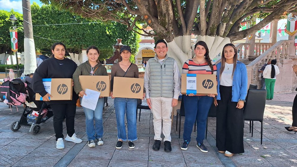 Churintzio, Michoacán. 22 de septiembre de 2025.- Durante el Lunes Ciudadano, el Presidente Municipal, Francisco Pérez Maldonado, además de la atención a la gente efectuó la entrega de cuatro computadoras, tipo laptop a estudiantes universitarios.