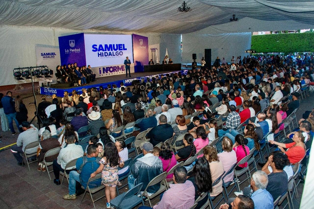 La Piedad, Michoacán. 9 de agosto de 2025.- “Gracias a su confianza, seguimos trabajando por las familias piedadenses, dando continuidad a una gestión que tiene como prioridad el sentido humano y social, logrando proyectos que poco a poco nos consolidan como una ciudad de avance y progreso”, expresó el Presidente Municipal de La Piedad, Samuel Hidalgo durante su 1er Informe de gobierno de este segundo periodo como alcalde.